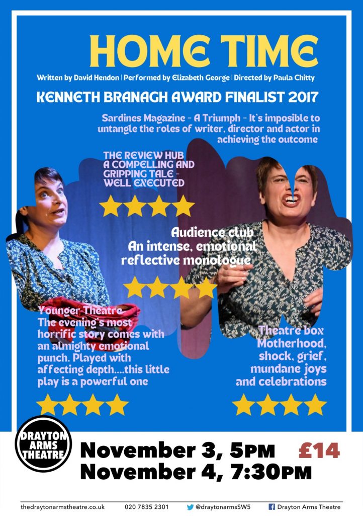 COURTYARD THEATRE JULY 6TH /7TH 7.30PM Play by David Hendon Directed by Paula Chitty. Performed by Elizabeth George. Produced by Irrational Theatre A meditation on motherhood, Hendon’s writing is first class in this surprising, shocking and heart wrenching monologue, brought to life theatrically by director Paula Chitty and actress, Elizabeth George. A finalist at The Kenneth Branagh Award in 2017 where it was hailed a triumph Sardines Magazine - A Triumph, someone sat behind me and said we should have stood to applaud and I agree. It’s impossible to untangle the roles of writer, director and actor in achieving the outcome but that’s what great theatre is all about, the structure is overlaid with beautiful dialogue. **** The Review Hub - The evening’s most horrific story comes with an almighty emotional punch that carefully side steps the sentimental and explores the effect of a shock tragedy on a single mother. **** Younger Theatre - A tale of love and loss and all that comes with it. **** Theatre box - A Harrowing piece about motherhood, shock, grief, mundane joys, degradation and celebrations that motherhood entailsshow less