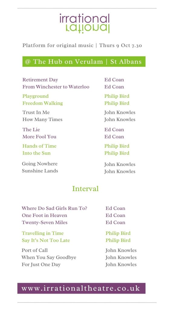 Irrational presents a refreshing and reflective night of orginal songs by John Knowles | Ed Coan | Philip BIrd at The Hub on Verulam, St Albans. Thursday 9th October 2025. 7.30 pm