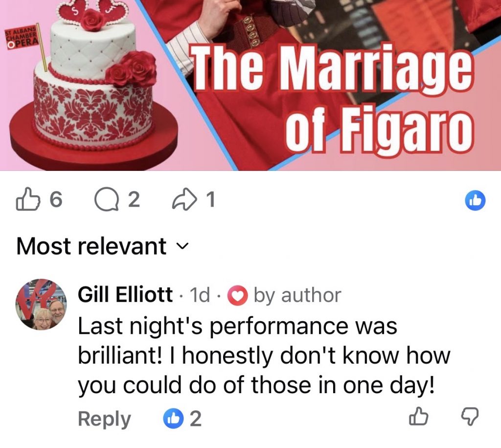 Well done for such a wonderful and imaginative production of Figaro, it worked a treat! We came on Tuesday and it was only the second time my friend had been to an opera and he loved it! I enjoyed it so much that I came back again last night, it was a wonderful entertainment, the production worked a treat. Michael R